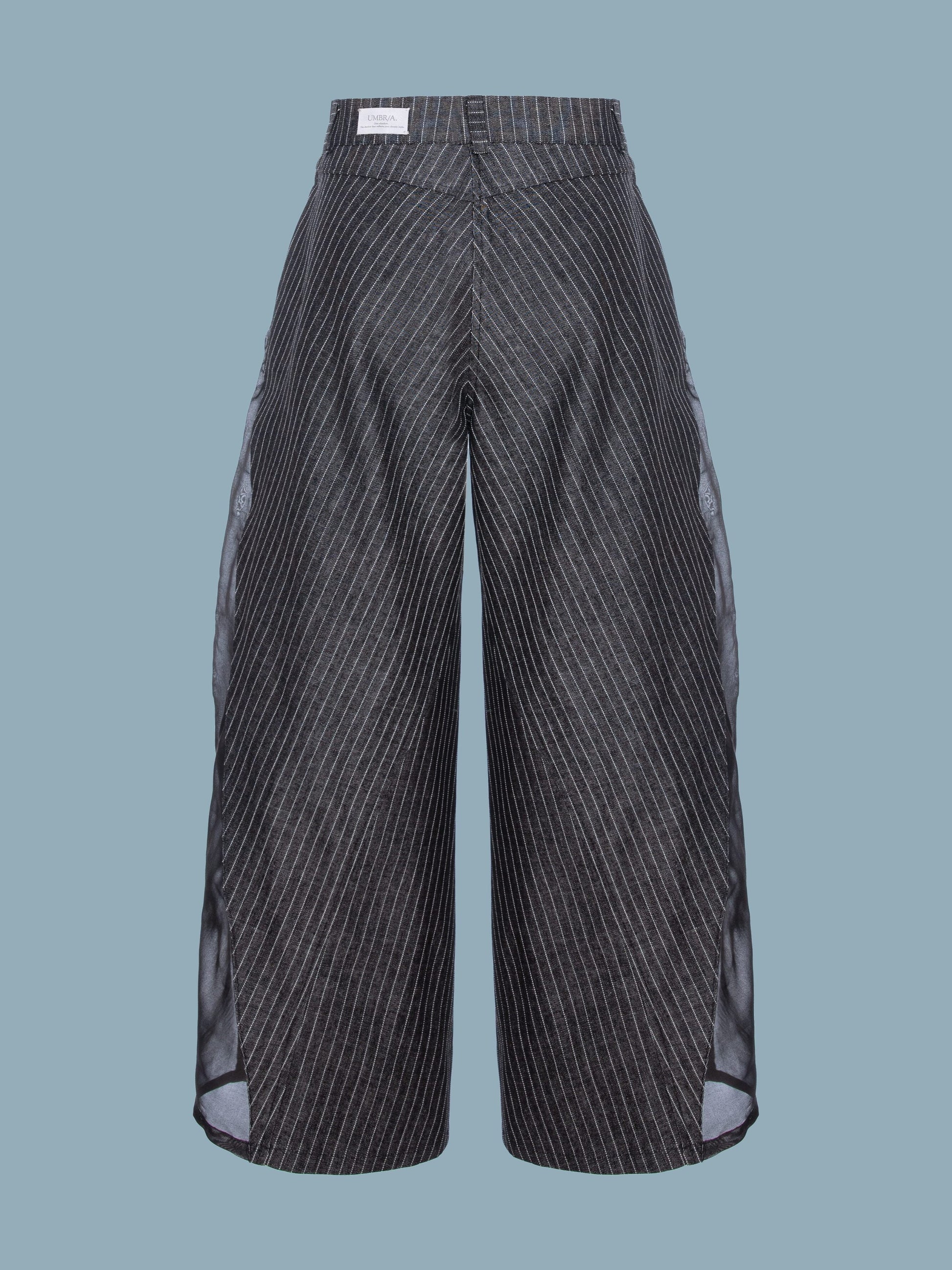 Pantaloni evazați din denim de bumbac, cu dungi fine verticale și inserții laterale din organza translucidă neagră. O piesă care combină structura robustă a jeanșilor cu delicatețea materialului, conturând un contrast subtil între forță și finețe.
